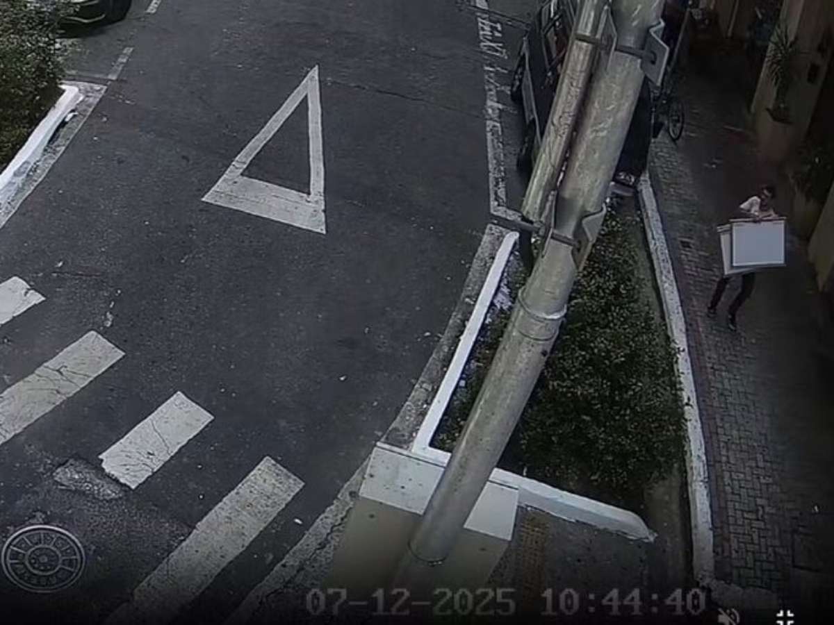 Em outro ângulo, é possível ver o homem que carregava as telas apoiando as obras contra um muro, ao lado de sacos de lixo, antes de deixar o local. O segundo homem atravessa a área logo depois, mas não interage com o material e continua caminhando.