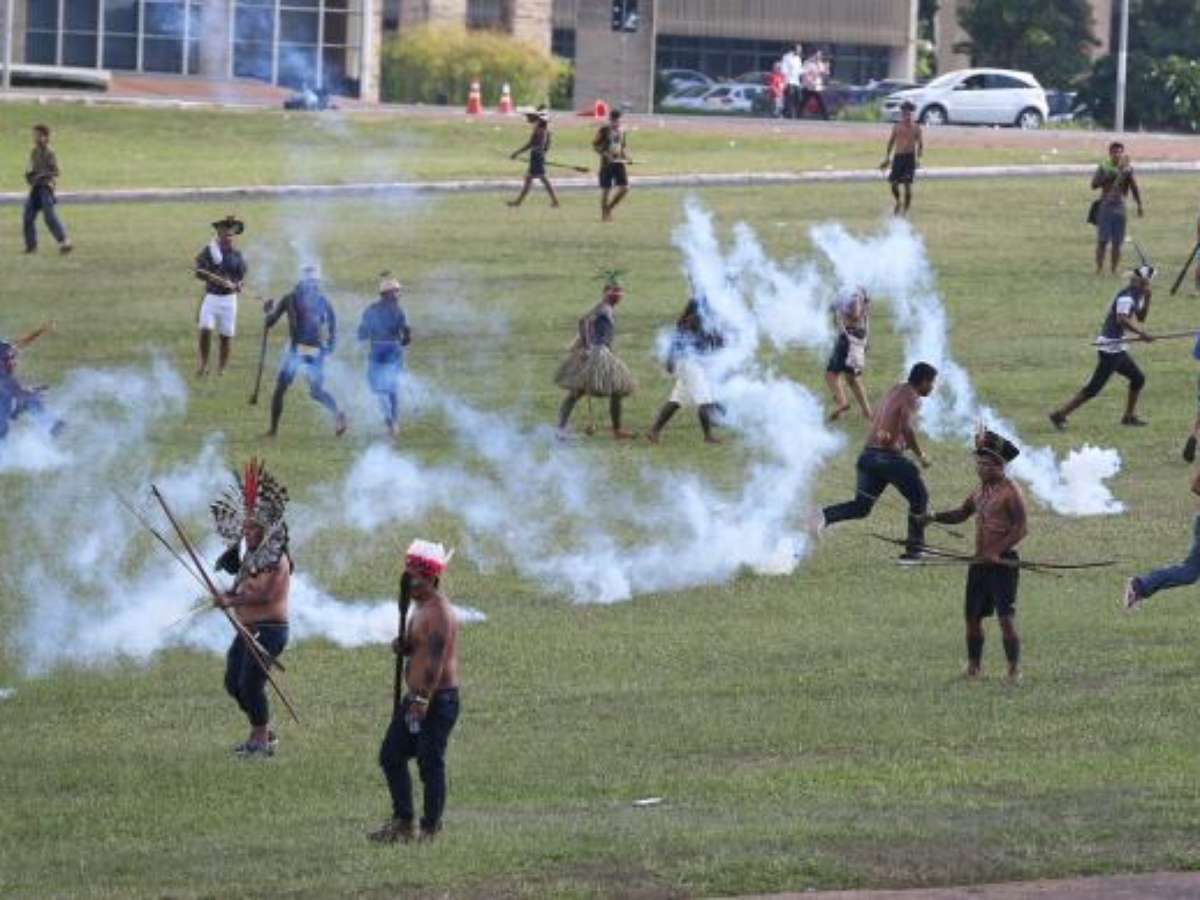 Indígenas que estão acampados na Esplanada dos Ministérios protestaram hoje (25) em frente ao Congresso Nacional e, ao tentar entrar no prédio, foram impedidos pela Polícia Militar, que atirou bombas de gás lacrimogêneo para dispersar o grupo.