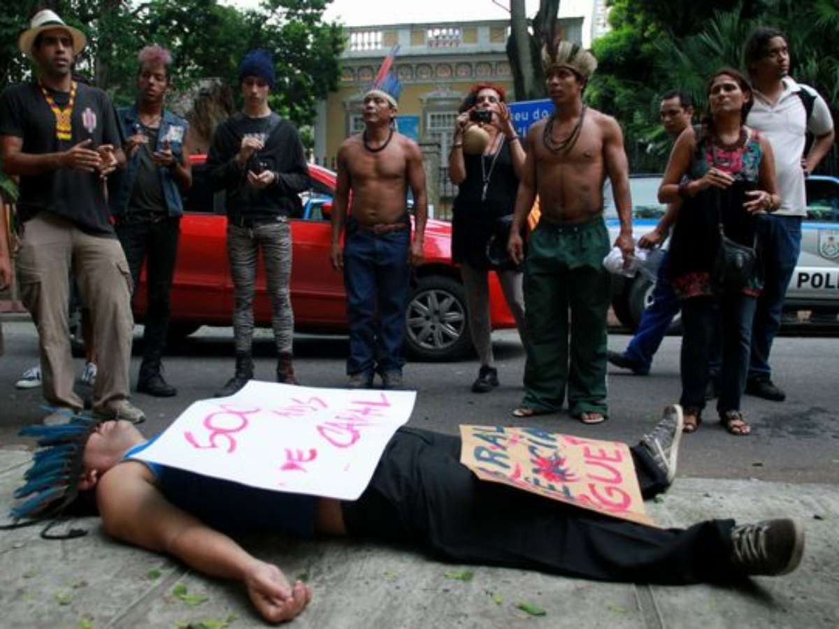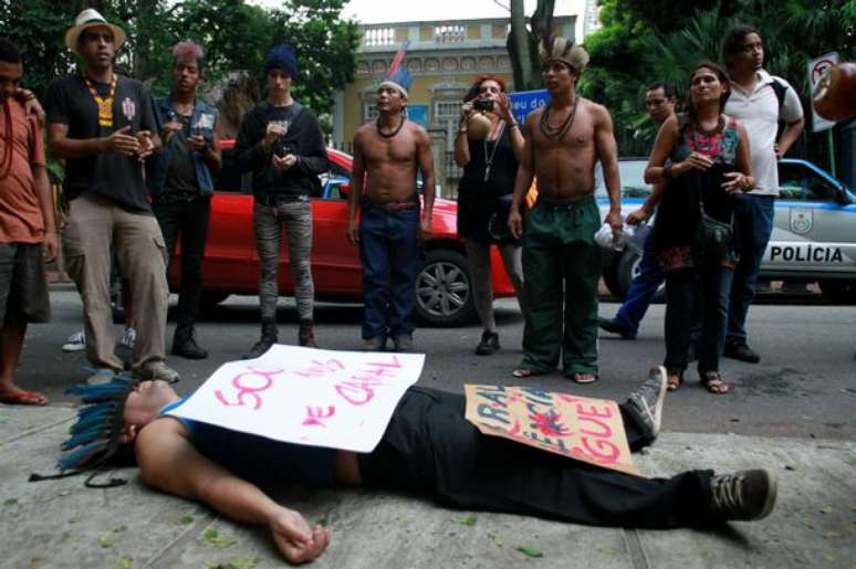 Manifestantes protestam em frente ao Museu do Índio, no Rio