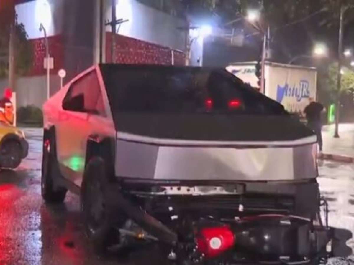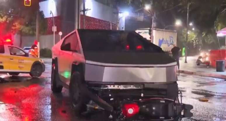 O veículo envolvido é um Tesla Cybertruck, picape elétrica da montadora americana Tesla, conhecida pelo desenho angular e pela carroceria em aço inoxidável.