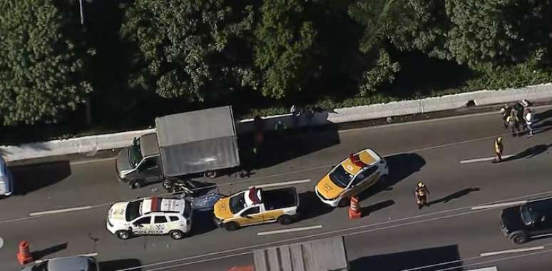 A ocorrência ocupa duas faixas da direita, com policiamento no local. A Companhia de Engenharia de Tráfego (CET) monitora o trânsito na região.