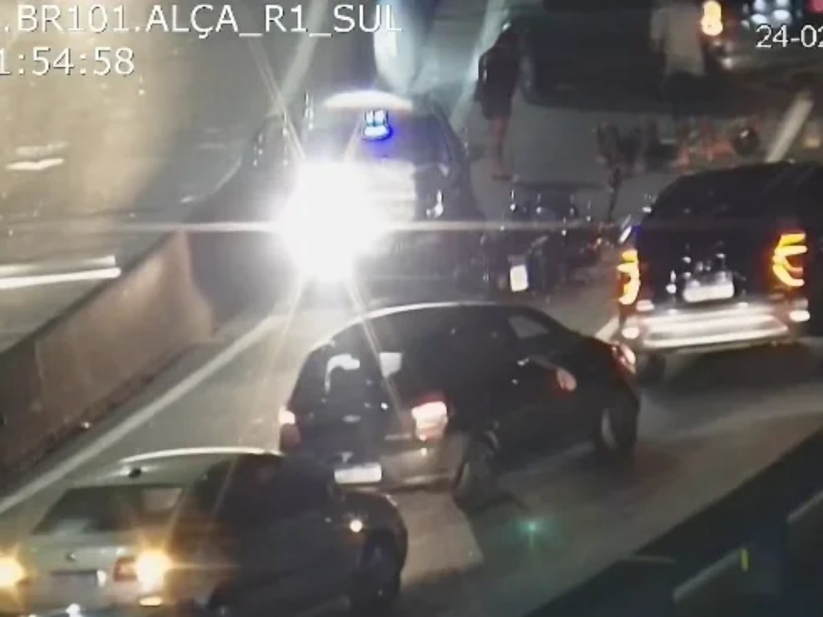 Imagens do sistema de monitoramento da concessionária que administra a ponte registraram o carro trafegando pela contramão e por pouco não colidindo com diversos veículos. Apesar de alguns motoristas conseguirem desviar, uma motocicleta foi atingida de frente.