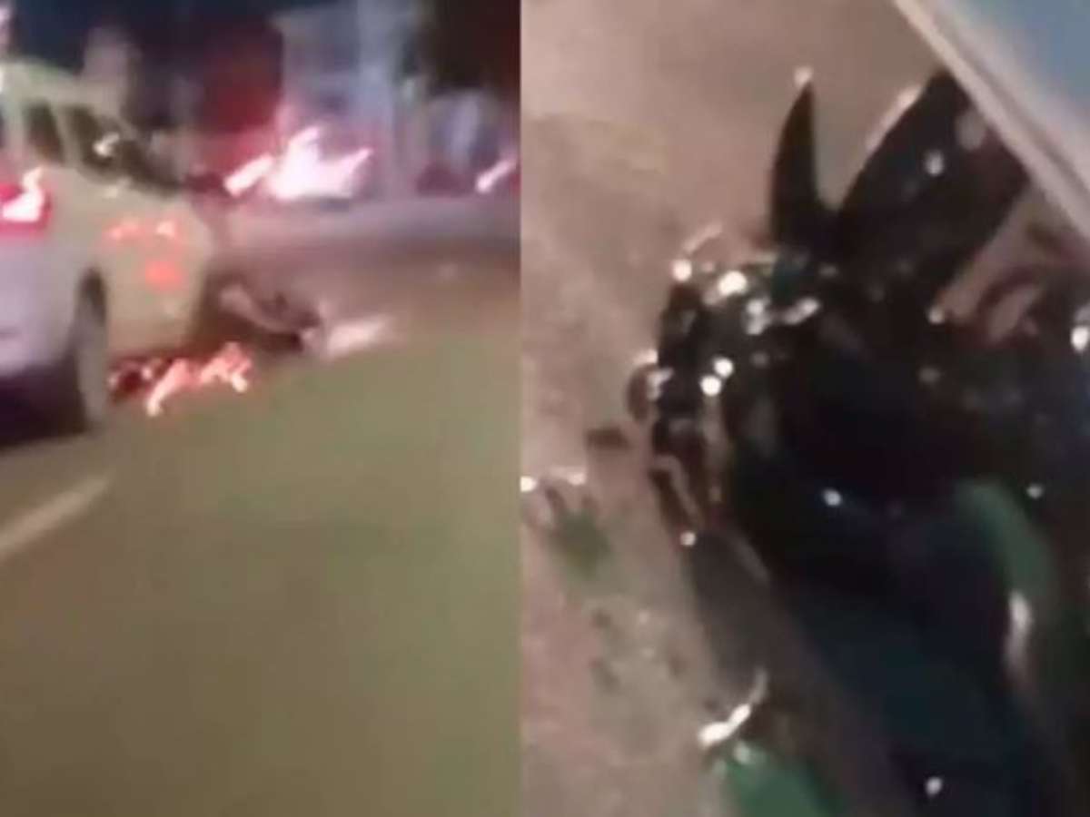 Vídeos que circulam nas redes sociais mostram o ocorrido. Nas imagens, é possível ver a moto na roda do carro da mulher, faíscas sendo causadas pelo veículo arrastado e outros carros buzinando para que a motorista parasse.