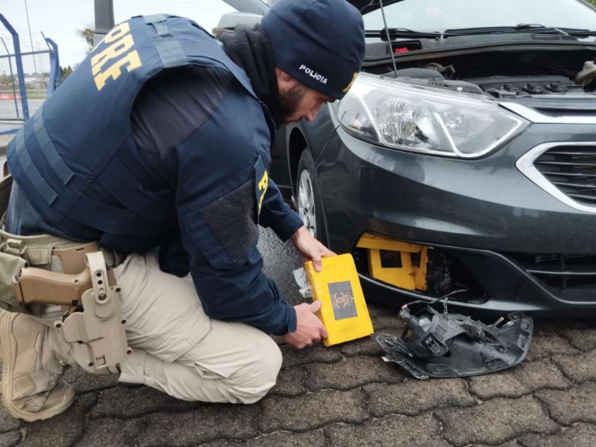 Após uma fiscalização mais detalhada, a condutora confessou que transportava drogas. Os agentes localizaram vários tabletes de cloridrato de cocaína escondidos em um compartimento atrás do farol dianteiro do carro.