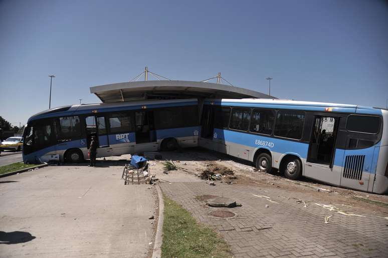 Um ônibus articulado invadiu uma estação de passageiros e deixou pelo menos 15 pessoas feridas, nenhuma delas com gravidade. Segundo a assessoria do BRT, que administra as linhas de ônibus, o acidente ocorreu quando uma viatura da Polícia Militar invadiu o corredor exclusivo para os coletivos. O motorista tentou desviar e acabou atingindo a estação.