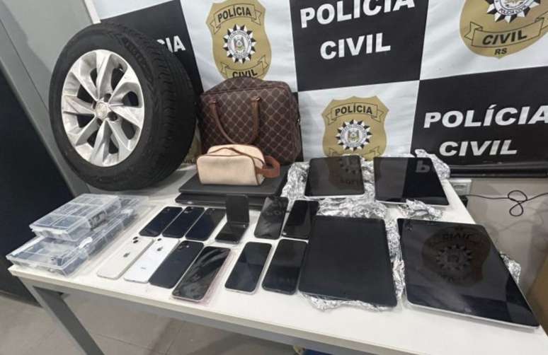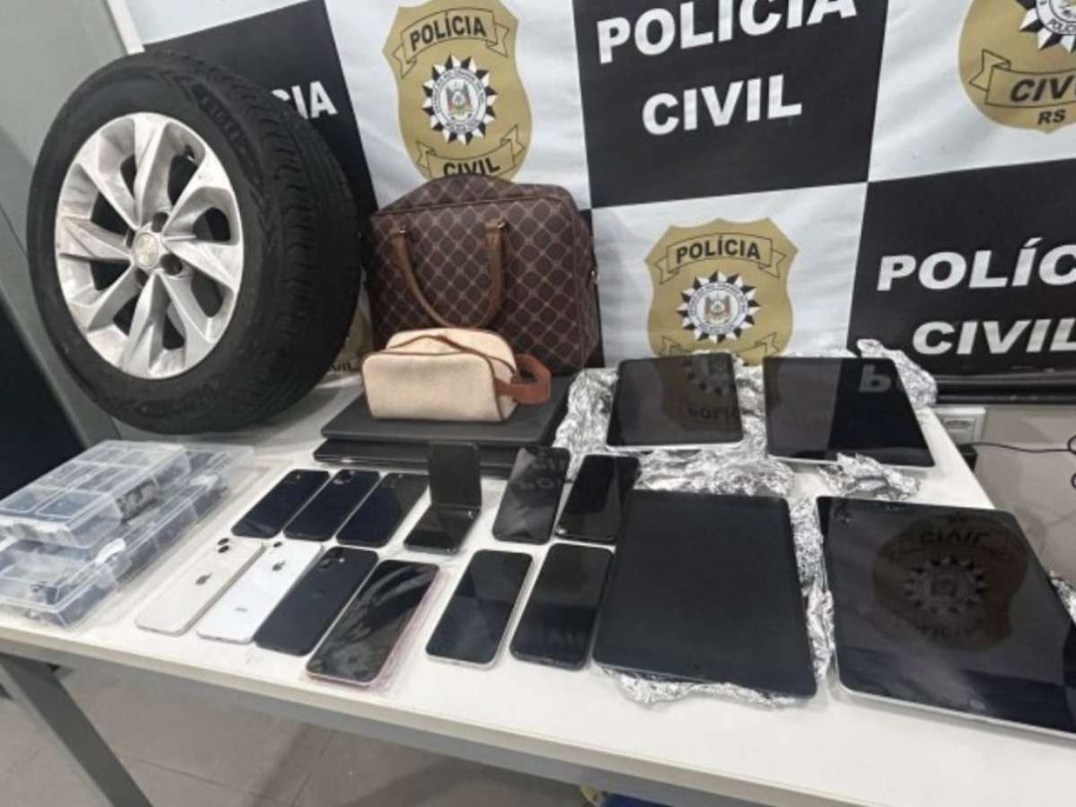 No cumprimento do mandado de busca em Sapucaia do Sul, os policiais localizaram o tablet furtado e apreenderam outros itens, incluindo mais de 12 celulares, quatro tablets e dois notebooks. Os aparelhos estavam, em parte, embalados em papel alumínio, estratégia usada para dificultar rastreamento.