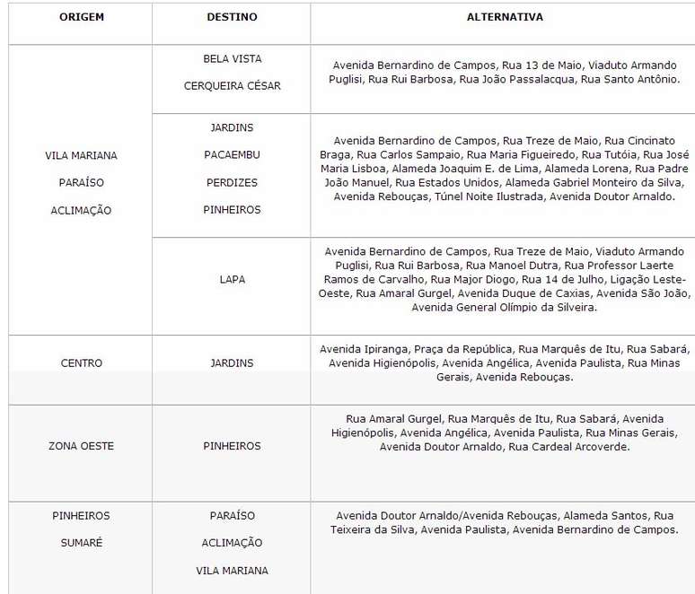 A partir de meio-dia, a rua da Consolação também será interditada, nos dois sentidos, entre a Alameda Santos e a avenida Ipiranga. Já a rua Rego Freitas será interditada entre a Consolação e a rua Major Sertório. Por fim, a avenida Ipiranga terá o tráfego proibido entre a rua da Consolação e a avenida São João.