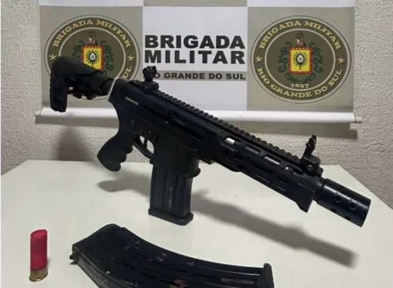 A revista no local revelou uma espingarda semiautomática da marca Derya, modelo MK-12, com numeração suprimida, além de dois carregadores - um com capacidade para 10 munições e outro para 20 - e um cartucho intacto calibre 12.