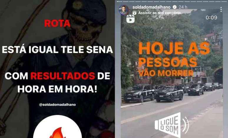 Já o perfil atribuído ao soldado Diogo Raniere escreveu que "hoje as pessoas vão matar" em uma publicação nos stories, de acordo com prints e vídeos que circulam nas redes sociais. Depois, compartilhou uma imagem que diz: "Não façam movimentos bruscos, boinas pretas na área", junto a uma atualização sobre o número de mortos contabilizados pela polícia.