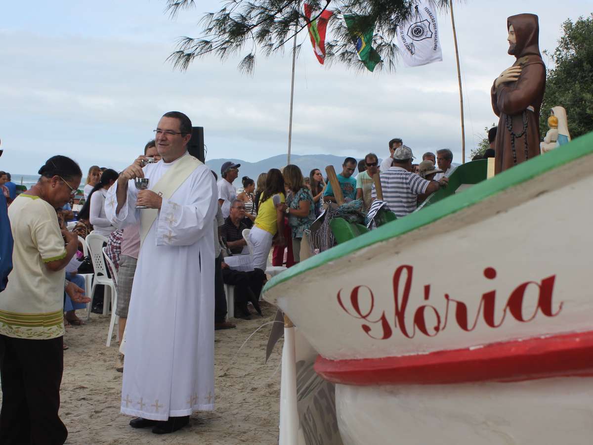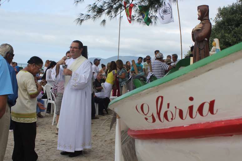 Um altar foi montado na entrada do rancho e um barco com redes de pescador recebeu várias imagens sacras para a missa. Mesmo com o tempo bastante nublado, os fiéis se amontoaram na areia da praia para assistir a cerimônia.
