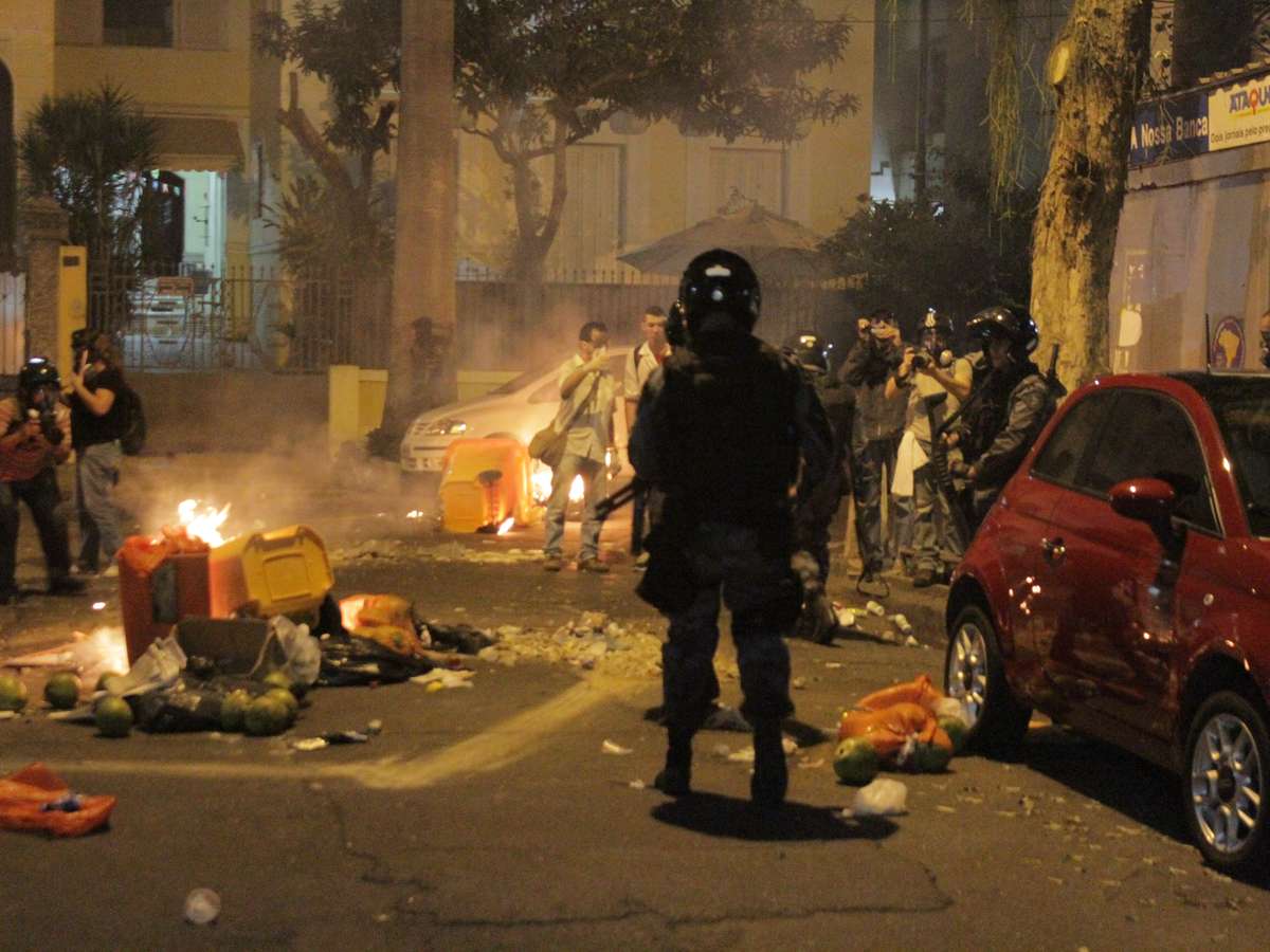 22 de junho - Na tentativa de furar o bloqueio, participantes do ato jogaram pedras, bombas caseiras e outros objetos. A polícia começou a revidar depois de 15 minutos e lançou bombas de gás lacrimogêneo