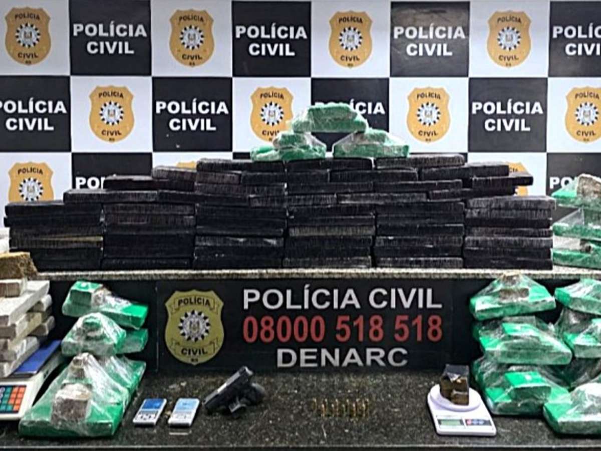 No interior do depósito, as autoridades encontraram um arsenal de evidências: 97 tijolos de maconha, porções de cocaína e quatro balanças de precisão para pesagem da droga. A apreensão de uma pistola Taurus calibre .9mm com munições evidencia o aparato de segurança utilizado pelos criminosos para proteger o patrimônio do grupo no local.