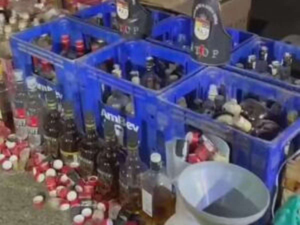 Durante a operação, os policiais encontraram uma grande quantidade de materiais utilizados na produção e adulteração de bebidas. Entre os itens estavam 150 garrafas vazias, tampas, selos de lacre e recipientes já preenchidos com líquidos que simulavam bebidas alcoólicas conhecidas.