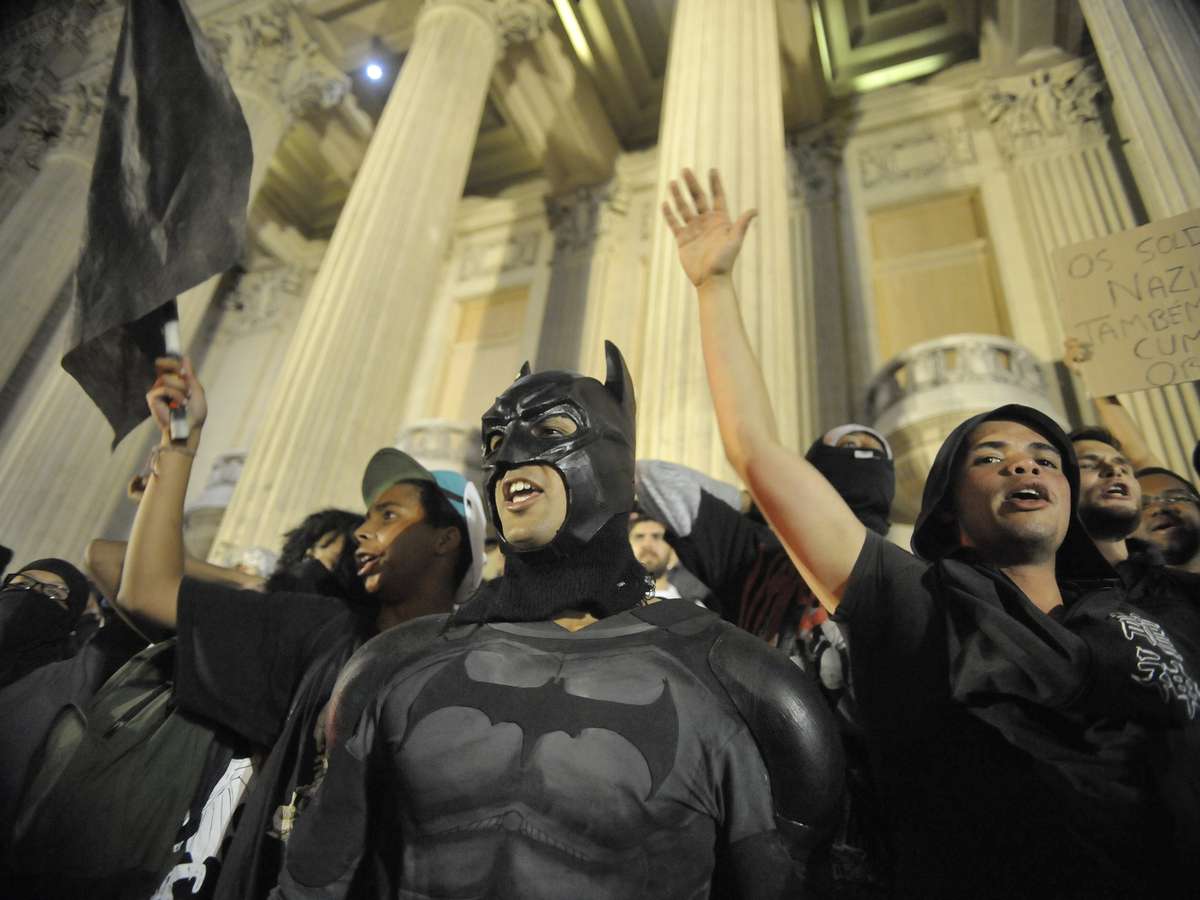 25 de setembro - Manifestante fantasiado de Batman se recusou a tirar a máscara e foi preso no Rio, por desrespeitar lei estadual que proíbe mascarados em protestos