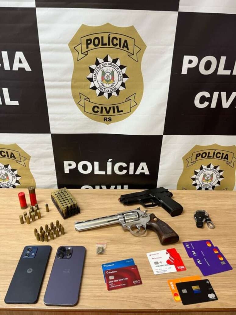 Durante o cumprimento dos mandados, na casa de L.S.S., os agentes encontraram uma arma de fogo, munições de calibres diversos, uma arma airsoft, cartões bancários em nome de terceiros, uma porção de maconha e um carro de luxo modelo Mercedes-Benz C250. O suspeito foi autuado em flagrante por posse ilegal de arma e munição, e o veículo foi recolhido pela polícia. A investigação segue para apurar a possível participação da dupla em outros crimes semelhantes.