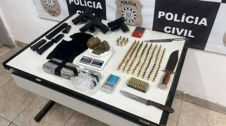 Durante a operação, foram apreendidas três pistolas — duas calibre 9 mm e uma .40 — e cerca de um quilo de maconha na residência de um dos suspeitos. Um homem de 29 anos, encontrado no local, foi preso em flagrante por tráfico de drogas e porte ilegal de arma.