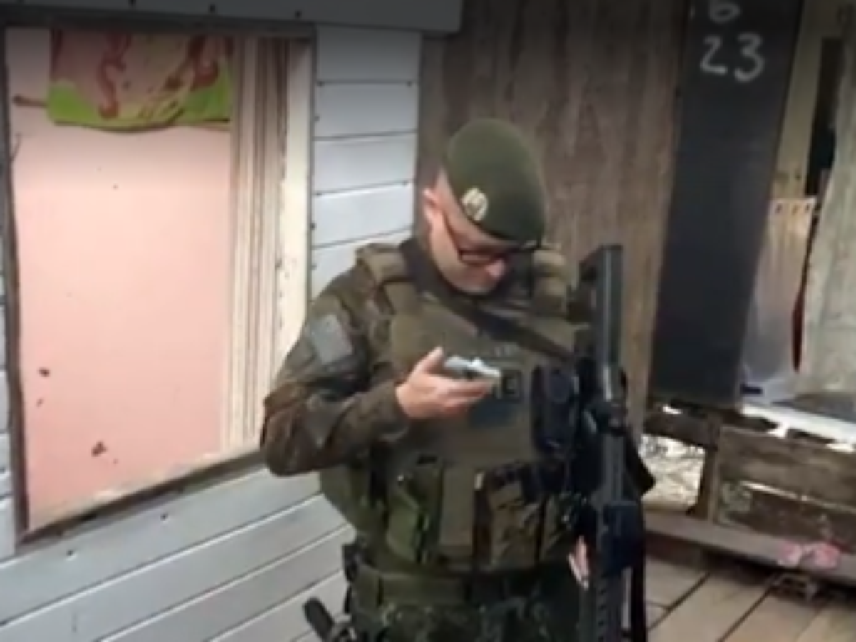 Policial aponta fuzil para repórter durante matéria em comunidade