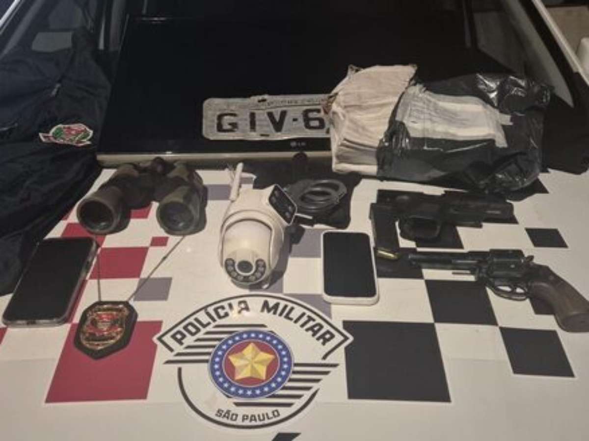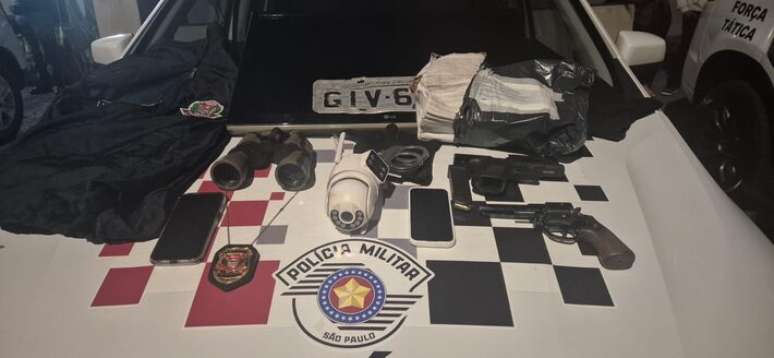 Na vistoria do veículo, os policiais militares encontraram diversos objetos, incluindo um televisor, binóculo, mochila com distintivo da Polícia Civil, algema, jaqueta da corporação, toucas tipo ninja, bonés, dois celulares (um da vítima) e a caixa com etiqueta contendo nome e endereço de uma das vítimas.