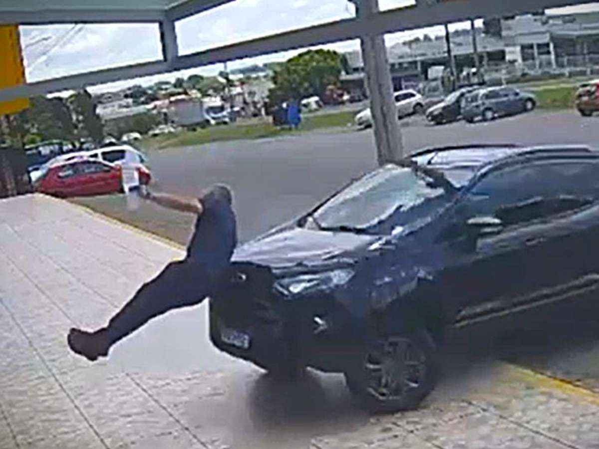 Imagens mostram o motorista manobrando e atingindo o policial, que foi arremessado para dentro de um estabelecimento comercial. Testemunhas relatam que o condutor chegou a sair do veículo e entrou no local onde o agente caiu.