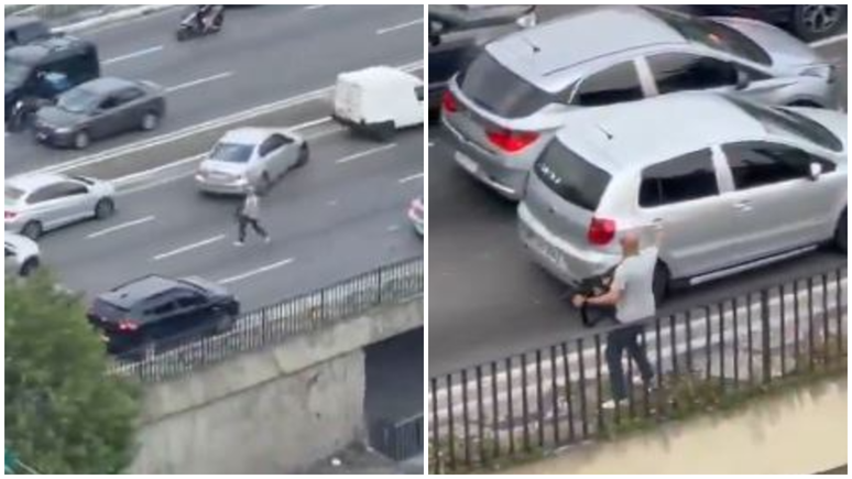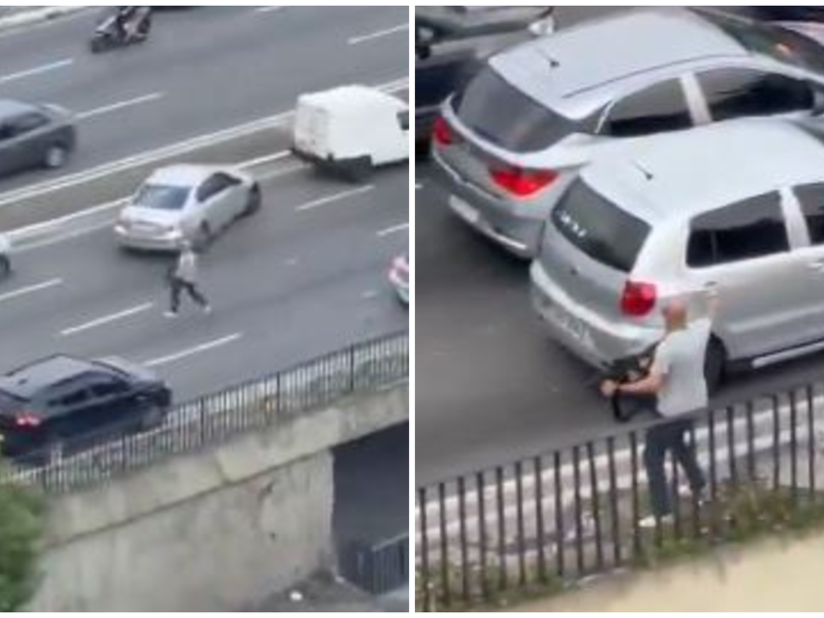Nas imagens, o policial desce armado de um carro e corre na direção de outro veículo na cor preta. Outros carros que estão passando pela avenida desviam. O agente para e dispara ao menos quatro tiros. Os suspeitos que estão no carro saem do veículo e deitam no chão.