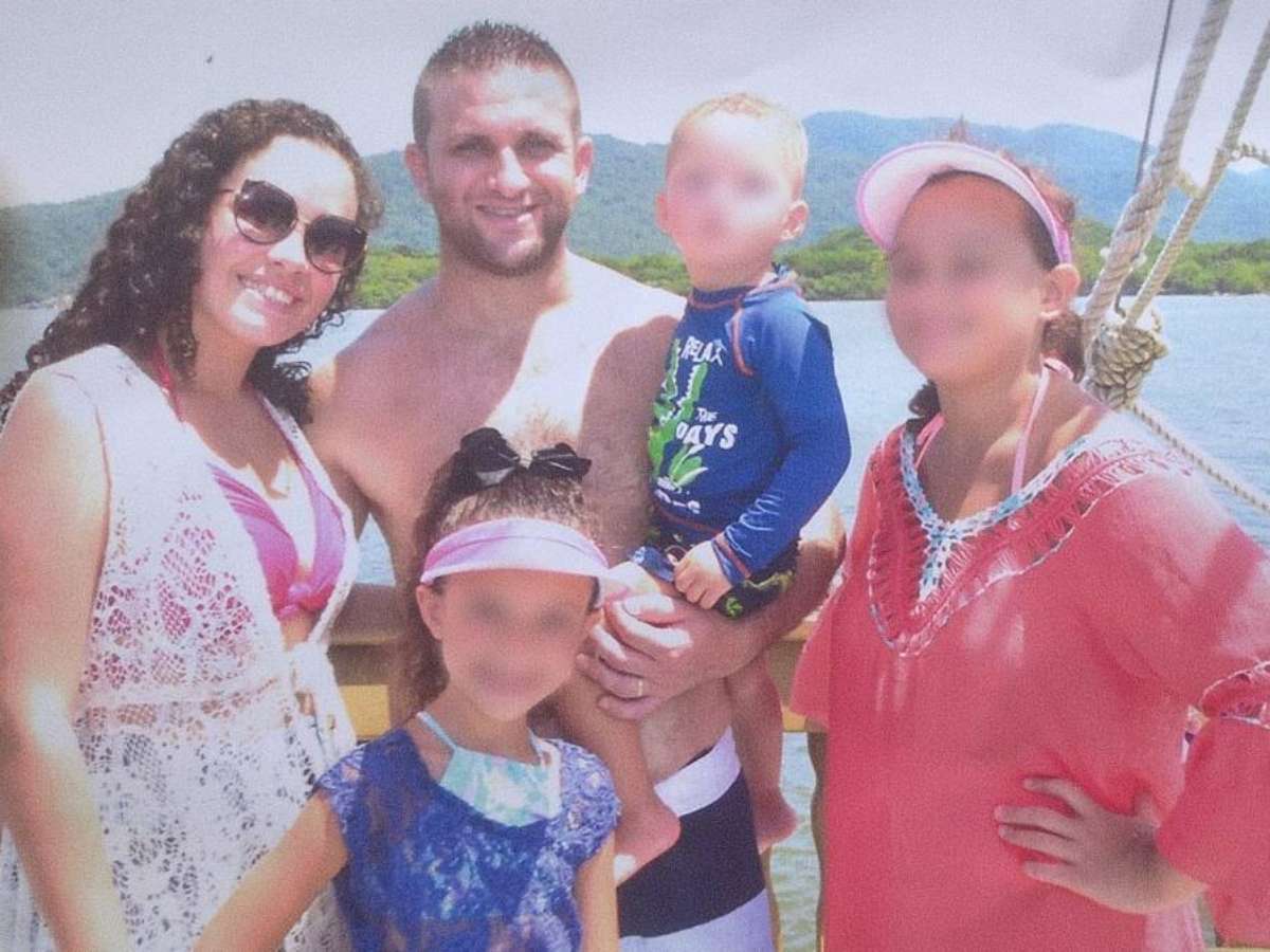 O PM Fabiano Junior Garcia, com a mulher Kassiele, a enteada e os dois filhos.