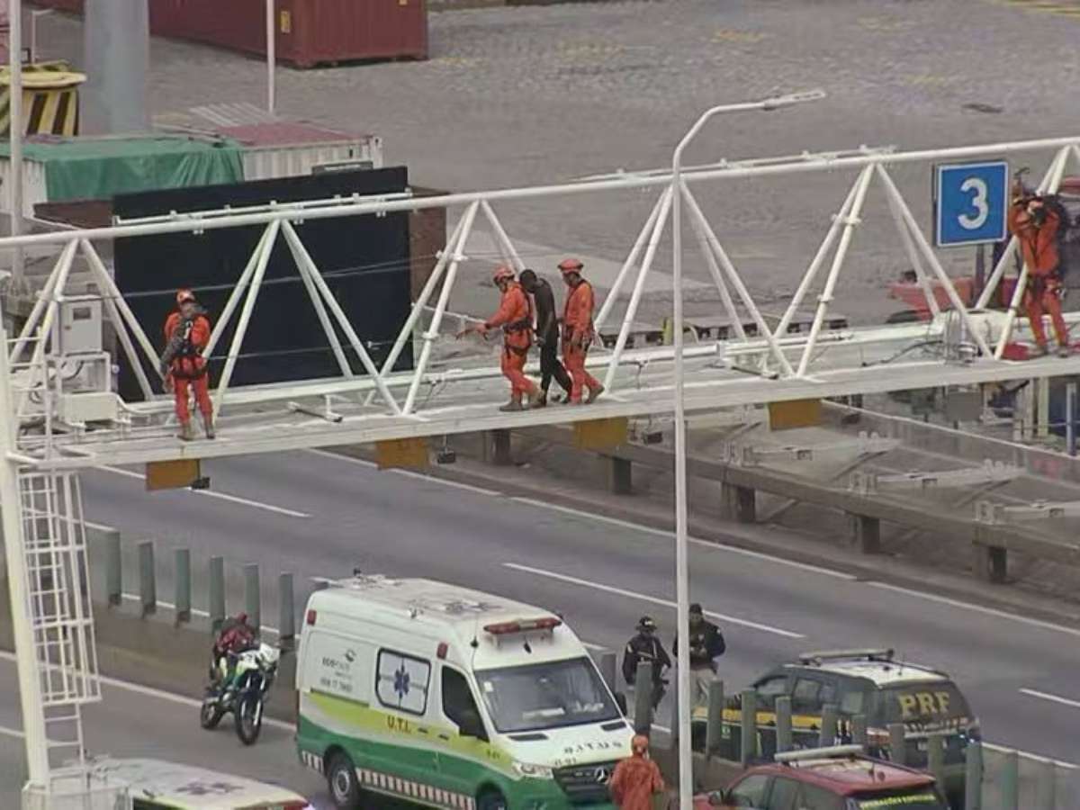 A Ponte Rio-Niterói foi interditada por 1 hora após um homem invadir a pista e escalar um pórtico de sinalização, gerando reflexos de congestionamento em vias do Rio de Janeiro.