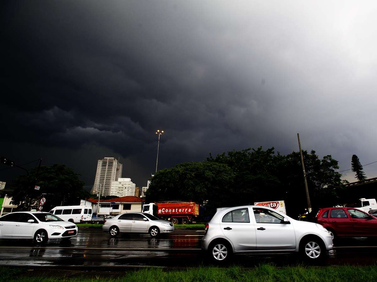 Em Moema, na zona sul da cidade, o céu ficou carregado de nuvens pouco antes do temporal