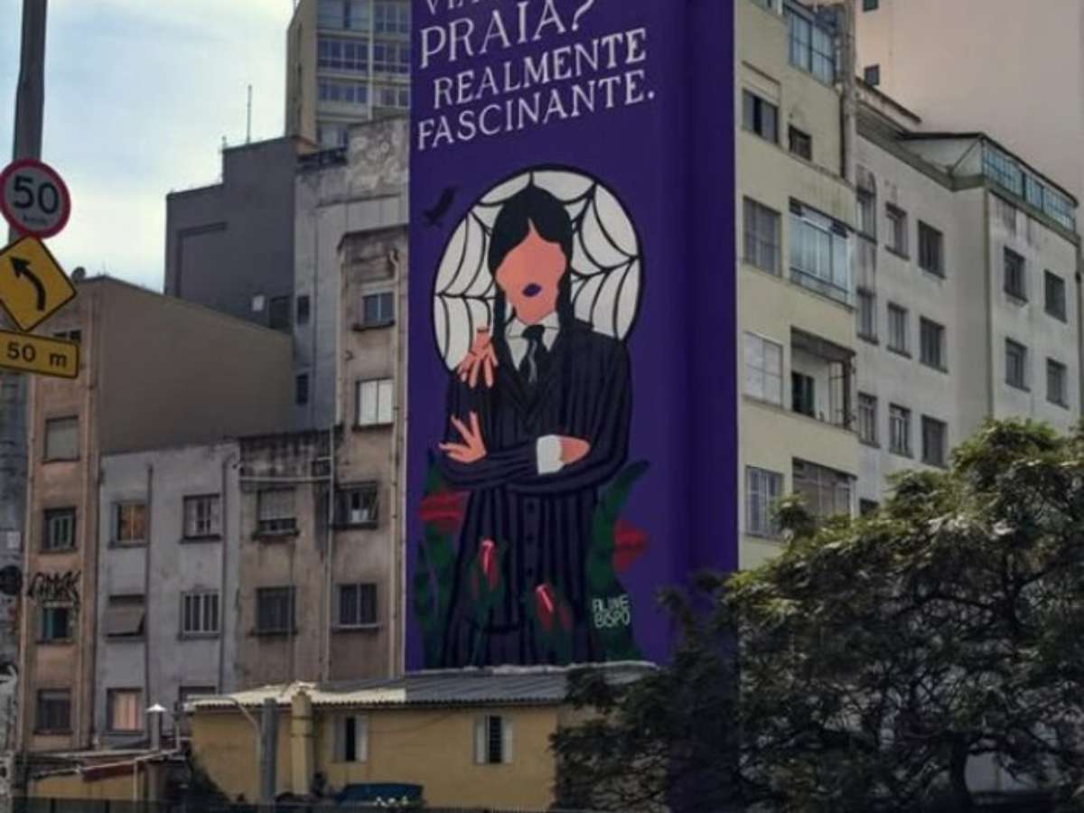 Com um fundo roxo, e a personagem ao centro com os braços cruzados, a arte adota um tom provocativo e irônico, típicos da personagem: "Viaduto praia? Realmente fascinante".