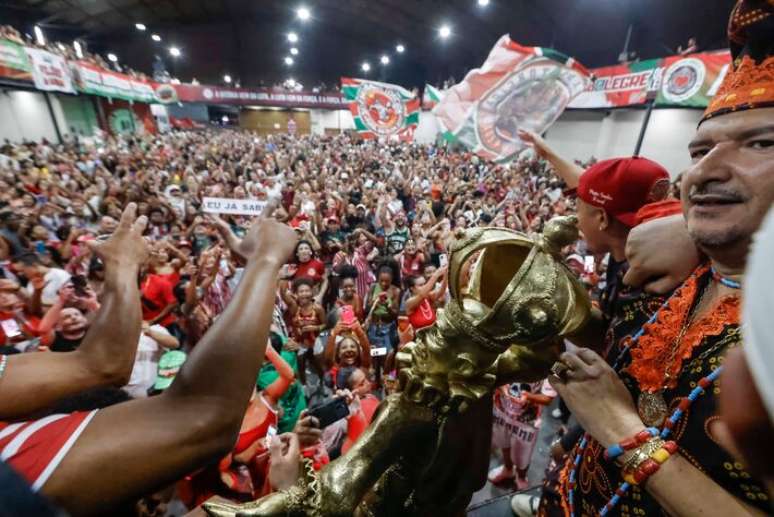 Na chegada do troféu à quadra, Solange agradeceu ao carnavalesco Caio Araújo, que foi ovacionado pela comunidade. Nos agradecimentos, a presidente mencionou componentes que fazem os bastidores do carnaval e citou profissionais de Parintins (Amazonas) que participaram do processo de preparação para o desfile. "Tivemos um percurso muito difícil esse ano na Fábrica do Samba e essas pessoas não soltaram a nossa mão", relembrou.