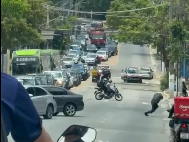 Os policiais tentaram encurralar os bandidos, com uma viatura posicionada em um lado da via e um policial que ficou mais acima na rua. As imagens mostram os agentes atirando contra a dupla, que conseguem passar pelos veículos e fugir por uma rua perpendicular à avenida.