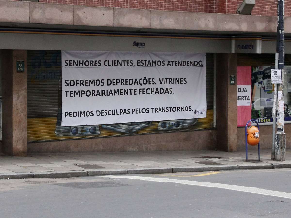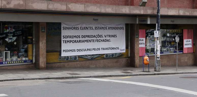 “Senhores clientes, estamos atendendo. Sofremos depredações. Vitrines temporariamente fechadas. Pedimos desculpas pelos transtornos”, dizia a mensagem no cartaz.