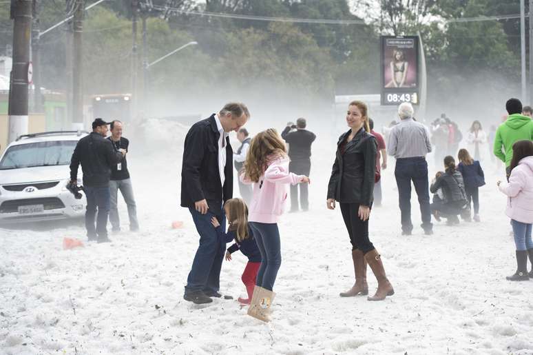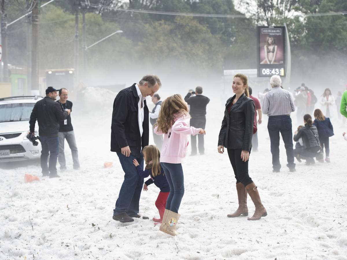 Ruas no bairro da Aclimação, na zona sul de São Paulo, amanheceram cobertas de gelo nesta segunda-feira, um dia após a chuva de granizo que atingiu pontos da capital paulista. Muitos aproveitaram a paisagem para construir bonecos, tirar fotografias e se divertir. Foi o caso da família Salvatore, que mora na vila Mariana. "O meu marido viu na televisão falando que estava com gelo acumulado e, como é muito perto de onde moramos, levamos as crianças porque elas nunca tinham visto gelo ou neve", contou a administradora de empresas Ana Salvatore.