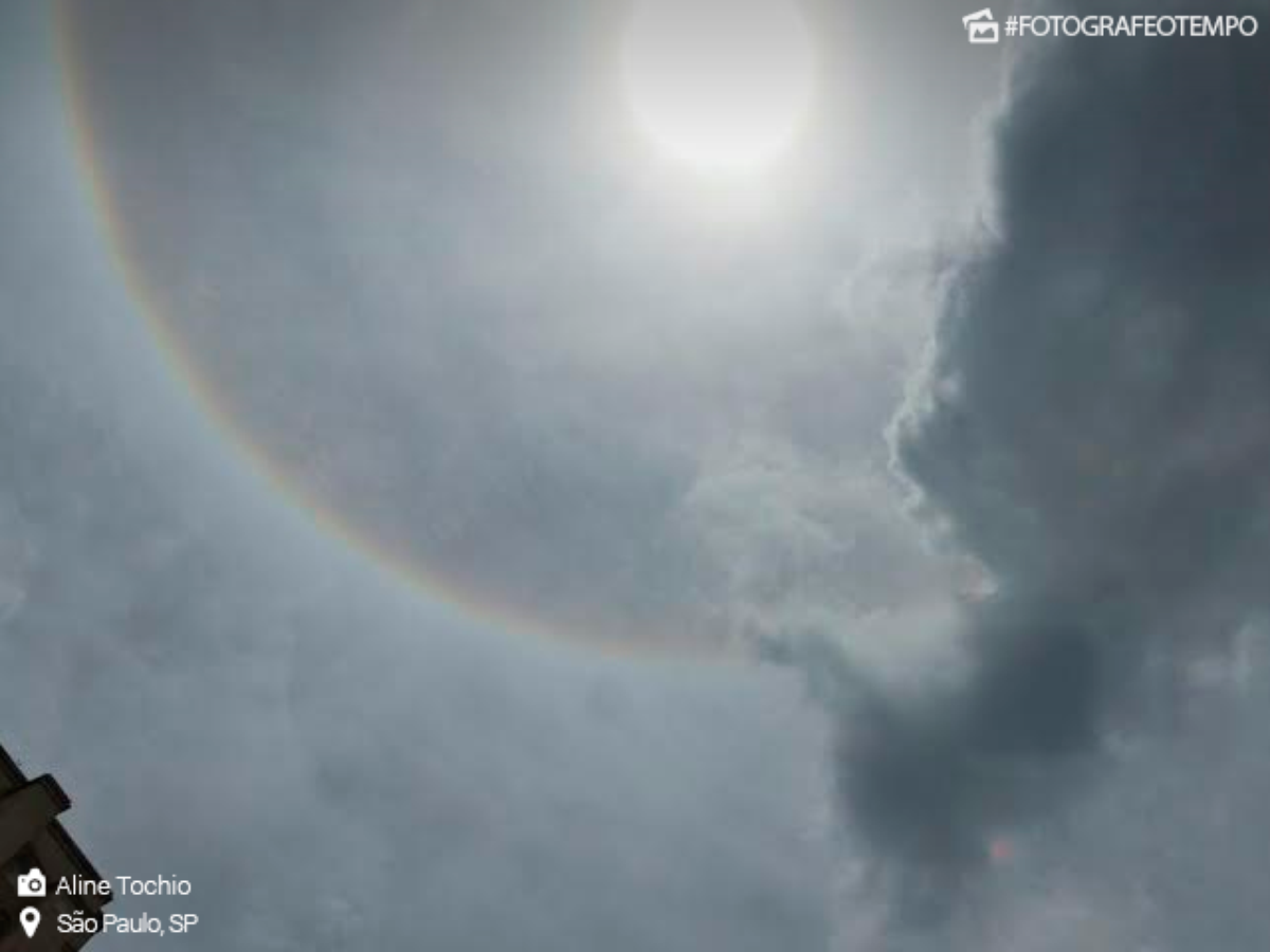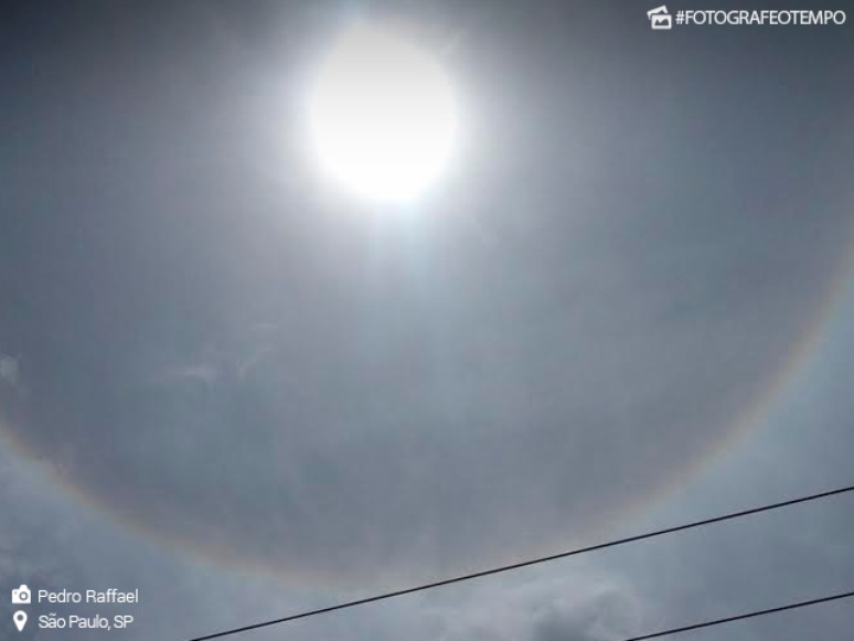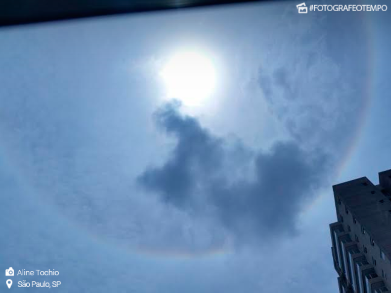 O céu da cidade de São Paulo surpreendeu novamente no fim da manhã da terça-feira, 16, não com nuvens negras, mas com um belo halo solar.