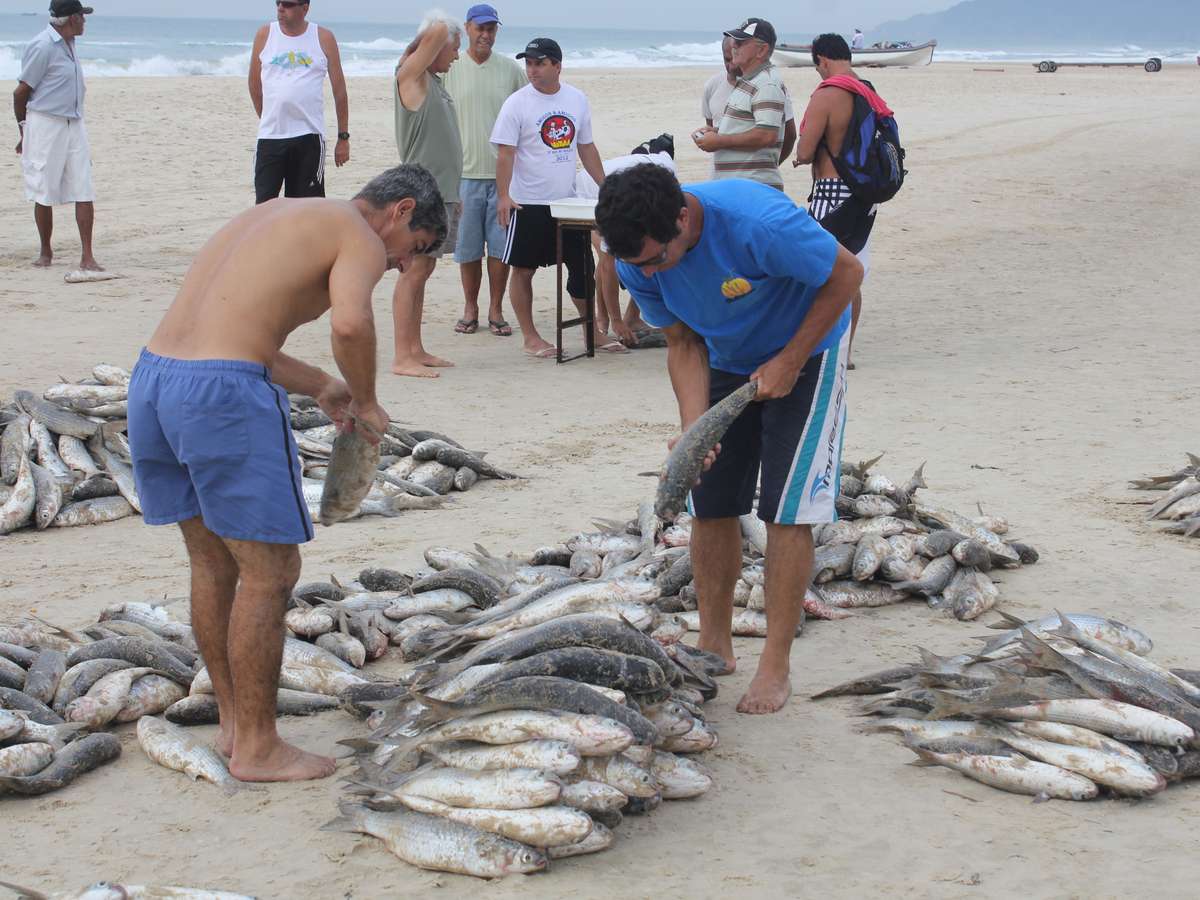 O período de “defeso” determinado pelos órgãos ambientais acabou nesta quarta-feira. Logo pela manhã, os “olheiros” avistaram o cardume na região do Campeche. Dois barcos fizeram três cercos e levaram os peixes para a areia. A pesca reuniu dezenas de pessoas: em cada barco, pelo menos 50 homens ajudaram a puxar a rede. Cada um deles ganhou um peixe para levar para casa. A atração da manhã foi a pilha de tainhas que se formou na areia da praia.