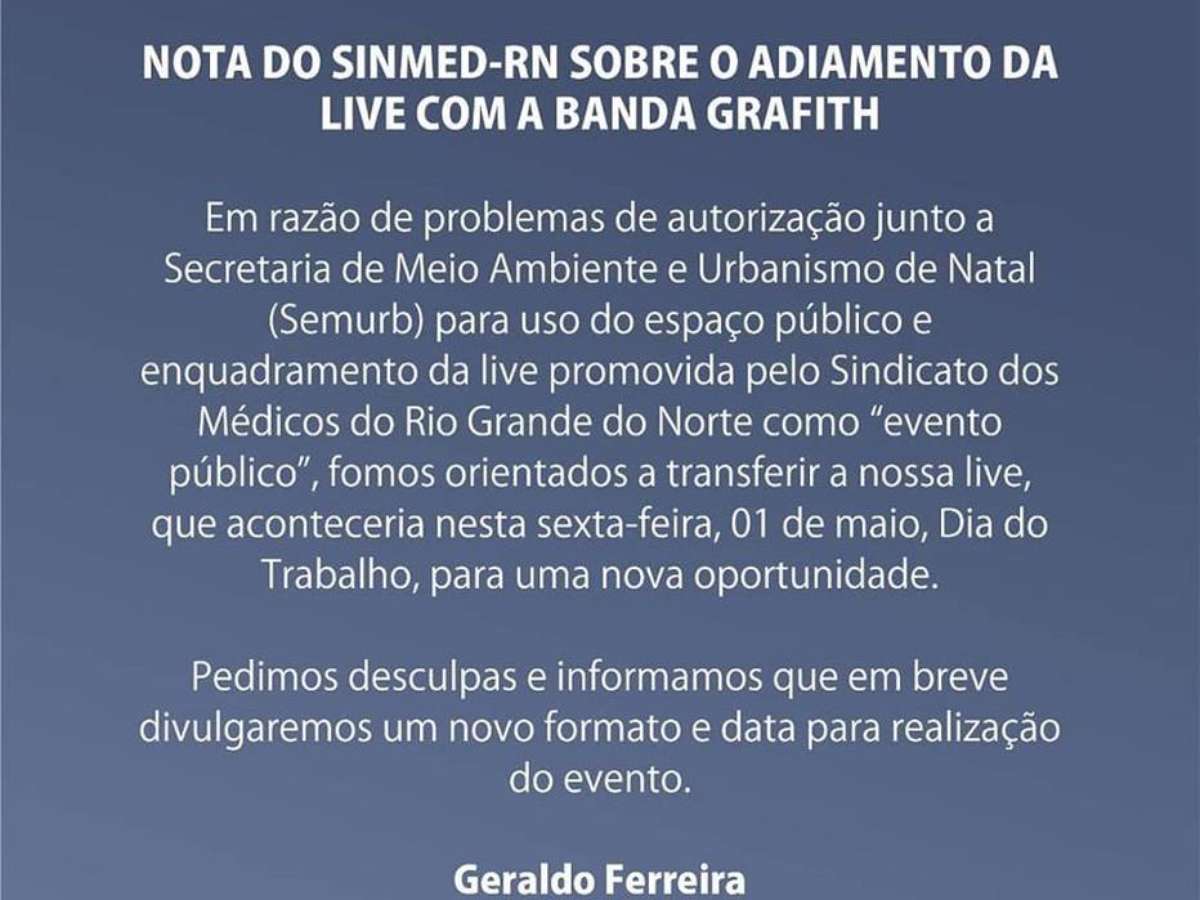 A Polícia Militar suspendeu na noite de sexta-feira, 1, um show realizado pelo Sindicato dos Médicos do Rio Grande do Norte (Sinmed-RN) no pátio do Hospital Walfredo Gurgel, em Natal. A performance da banda potiguar Grafith seria transmitida ao vivo nas redes sociais do sindicato, em celebração ao feriado do Dia do Trabalho. De acordo com o órgão, a intenção do evento seria homenagear médicos, profissionais da saúde e de serviços essenciais que trabalham em meio à pandemia do coronavírus.