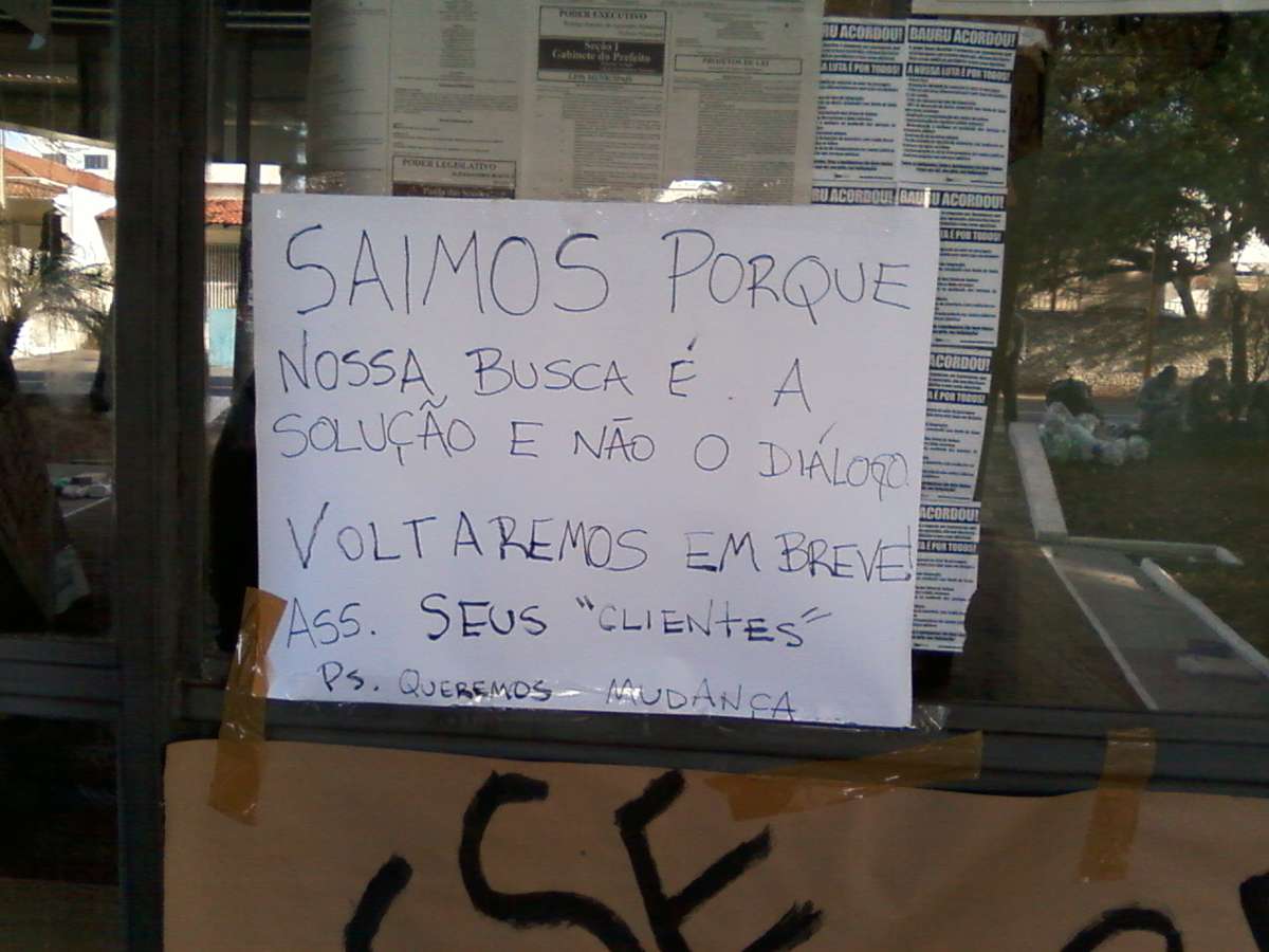 Durante a madrugada, parte dos manifestantes escreveu cartazes e colou nos vidros, indicando que novos protestos podem acontecer a qualquer momento. “Saímos porque nossa busca é a solução e não o diálogo. Voltaremos em breve. Ass: seus ‘clientes’”, dizia um dos cartazes.