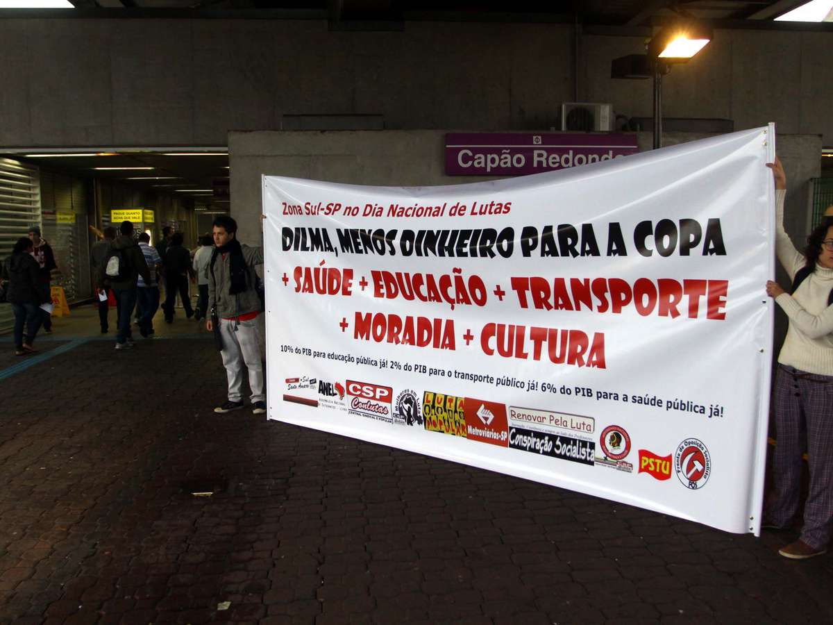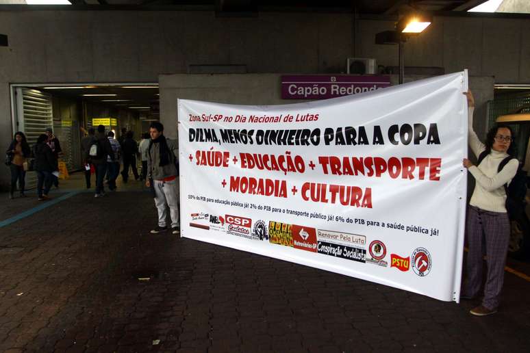 Manifestantes se reúnem na manhã desta quinta-feira em frente à estação Capão Redondo do metrô, na zona sul de São Paulo, para um protesto marcado para as 10h. Segundo a Polícia Militar, está prevista a presença de 10 mil pessoas na manifestação. O grupo mostrava uma faixa exigindo que o governo federal gaste menos com a Copa das Confederações e do Mundo e pedindo mais investimentos em saúde, educação, transporte, moradia e cultura.