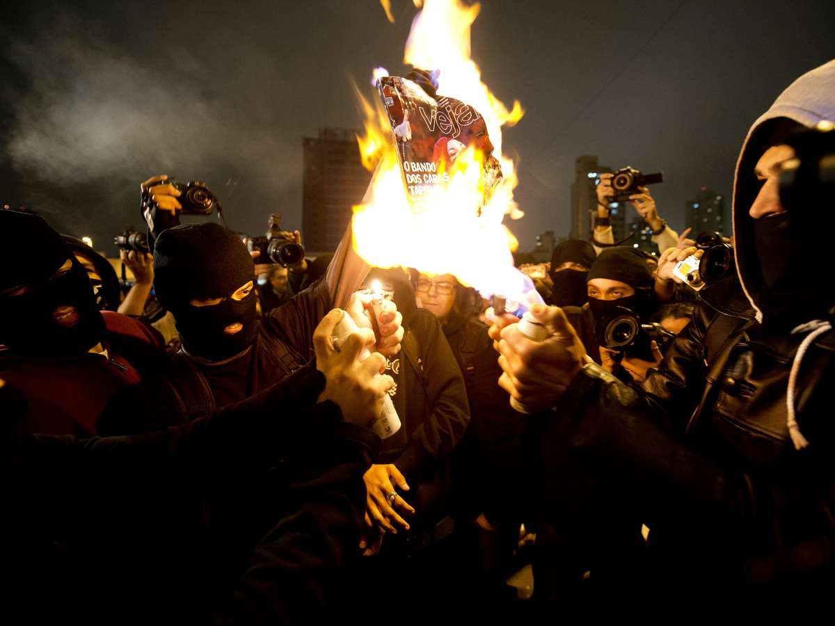 23 de agosto - Reportagem de Veja sobre o movimento Black Blocs desagradou os manifentantes, que atearam fogo à publicação