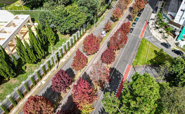 A cor das folhas começou a mudar e um dos mais famosos corredores verdes de Curitiba está assumindo os tons vermelhos, que fazem muito sucesso agora na época do outono. Até o final do mês de maio, as calçadas ficarão ainda mais bonitas com o vermelho das folhas das 853 árvores liquidâmbares (Liquidambar styraciflua).