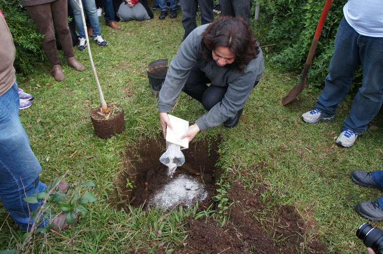 Márcia Dias, mãe de Rafael, deposita cinzas do filho em espaço onde foi plantada uma das árvores no Jardim Botânico da UFSM