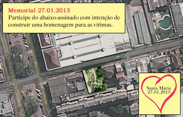 Destinado ao prefeito de Santa Maria, o abaixo-assinado pede "um memorial com o nome de todos aqueles que foram embora deixando seus sonhos sem realizar, que deixaram seus familiares, parentes e amigos em desespero. Homenageando também aqueles que sobreviveram, e os heróis que ajudaram a salvar vidas". Qualquer pessoa pode assinar o pedido por meio da internet.