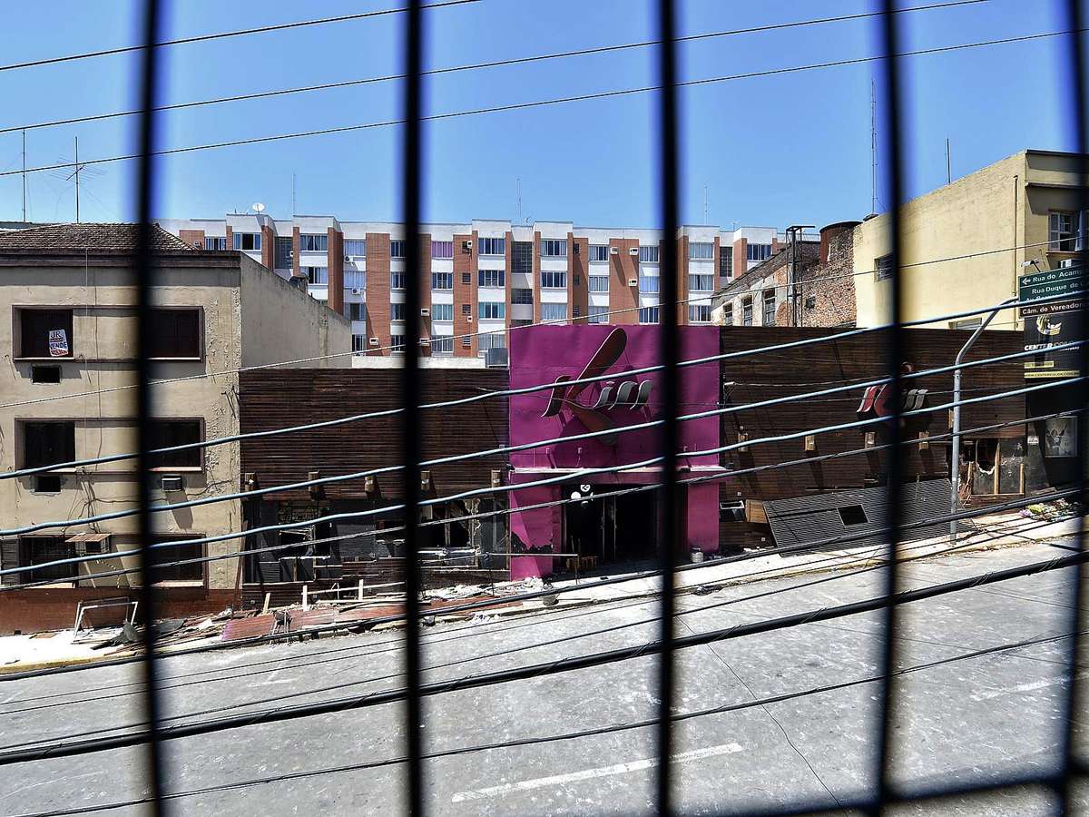 Imagem desta segunda-feira (28) da fachada da boate Kiss mostra rastro de destruição deixado por incêndio que matou 231 pessoas em Santa Maria, Rio Grande do Sul, na madrugada de domingo (27)