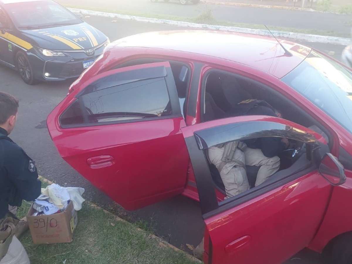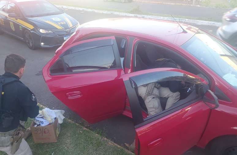 Os agentes realizavam fiscalização de rotina quando identificaram um Chevrolet Onix, com placas de Viamão, veículo que já constava em informações repassadas à PRF por possível ligação com o crime. Durante a abordagem, os policiais localizaram no interior do carro diversos produtos subtraídos da loja, incluindo uma televisão, três aparelhos celulares, um console PlayStation 5 e uma quantidade significativa de itens do setor de beleza.