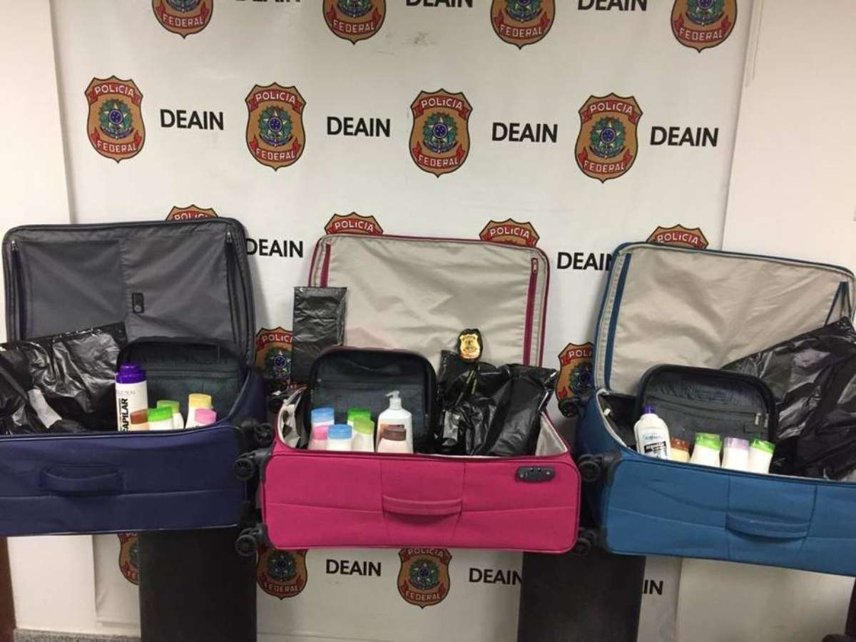Um casal foi interceptado ao tentar embarcar para Bruxelas com 20 kg da droga, escondida nos forros de três malas e também diluída em diversos frascos de cosméticos.