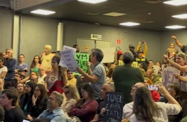 Grupos contrários à obra, incluindo vereadores, acusaram a Prefeitura de barrar pessoas que tentavam participar do encontro e alegaram que o espaço do Instituto de Engenharia, na Vila Mariana, onde ocorreu a audiência, era pequeno para sediar o evento.
