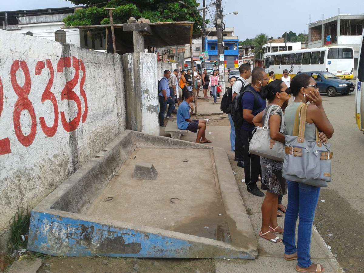 Para os moradores, resta uma pequena faixa do calçamento e um ponto improvisado com um pedaço de lona para proteger os usuários do sol.