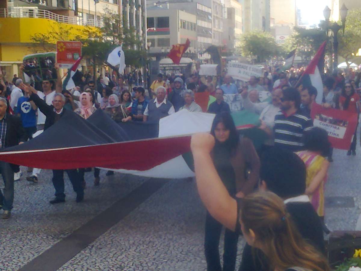 Um grupo com cerca de 500 pessoas - segundo os organizadores - se reuniu no início da tarde desta sexta-feira no centro de Curitiba, capital do Paraná, em um ato de solidariedade ao povo palestino. A marcha, com início previsto para as 12h, partiu das escadarias da Universidade Federal do Paraná, na praça Santos Andrade, e seguiu até as imediações da praça General Osório, na chamada Boca Maldita.