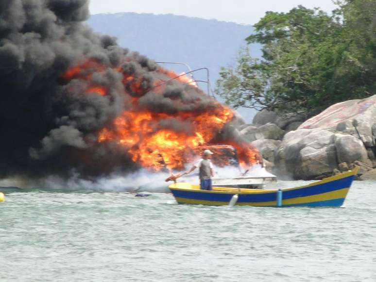 vc repórter: lancha pega fogo e afunda em SC; marinheiro escapa