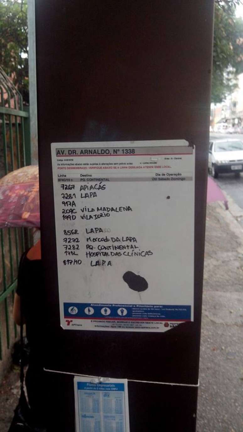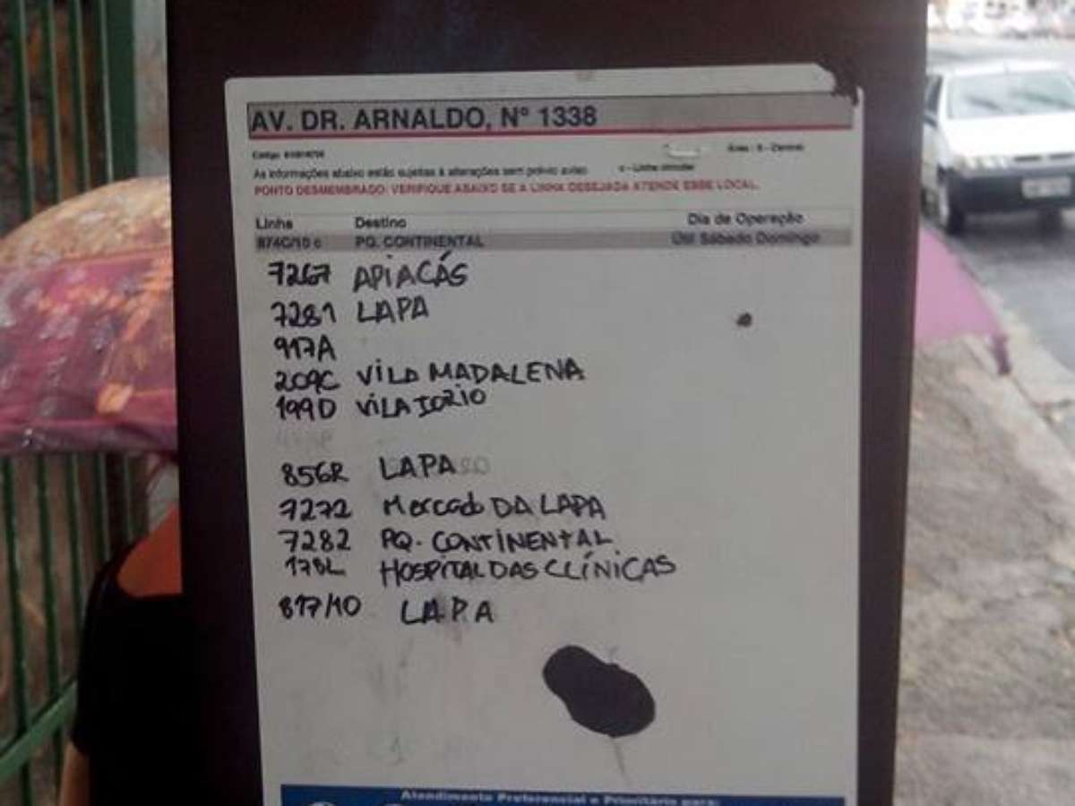 A placa instalada em um ponto de ônibus na altura do número 1.338 da avenida Doutor Arnaldo, no bairro do Sumaré, zona centro-oeste de São Paulo, tem chamado a atenção dos usuários do transporte público que esperam pelos coletivos no local. A sinalização, utilizada para informar sobre as linhas que transitam na via, foi escrita à mão.