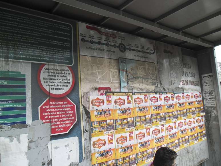 Uma quantidade imensurável de cartazes, lambe-lambes e adesivos colados de maneira irregular poluem visualmente as ruas e, principalmente, os pontos de ônibus do bairro do Fonseca, em Niterói, no Rio de Janeiro.